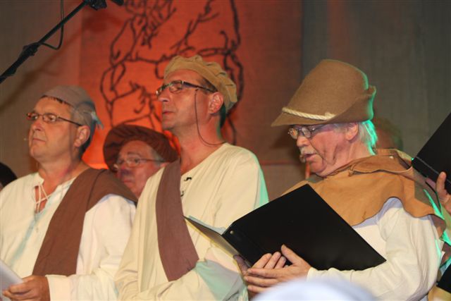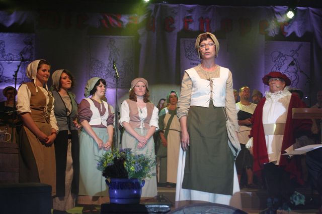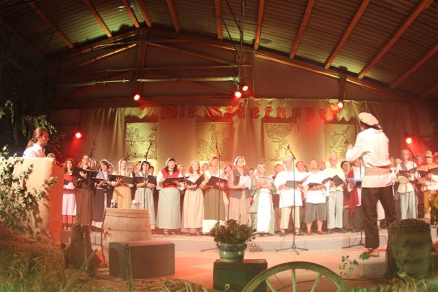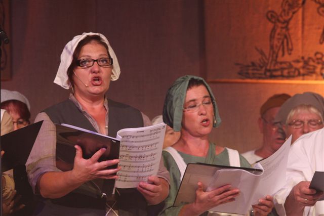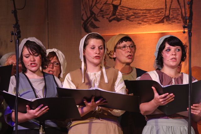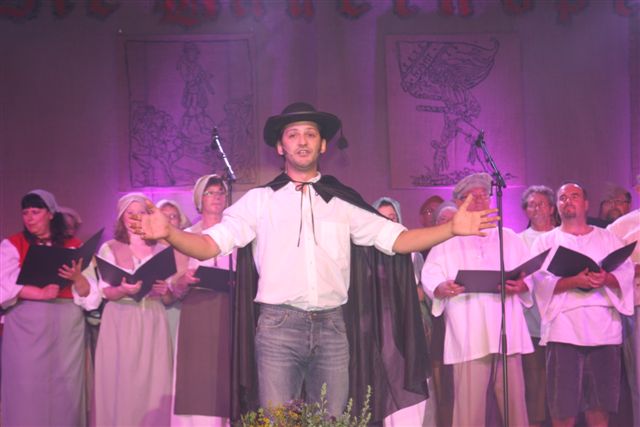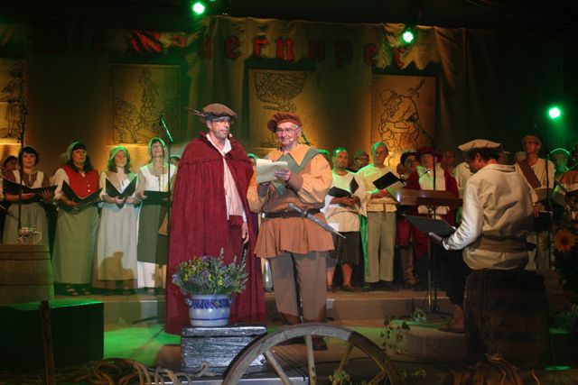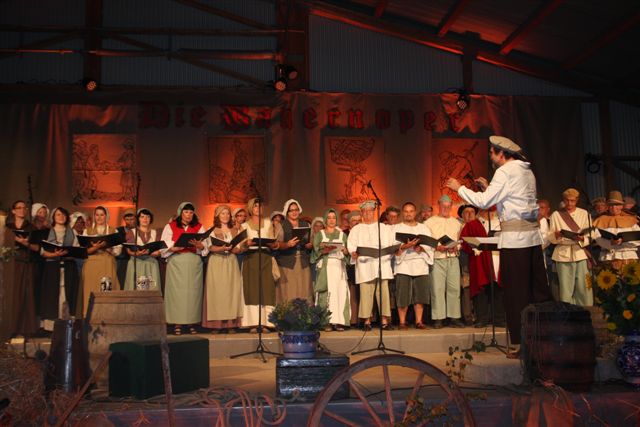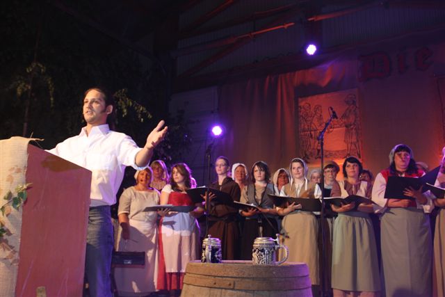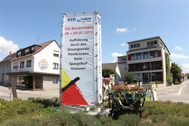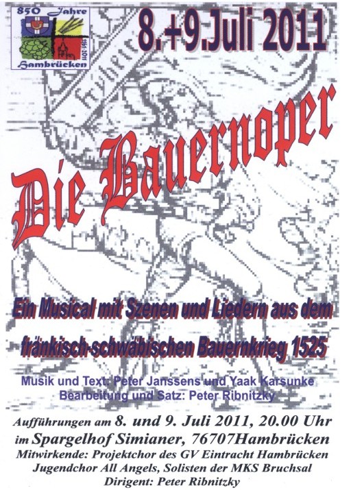 „Ein einfaches Stück über einfache Leute“, so bezeichnete Textautor Yaak Karsunke selbst „Die Bauernoper“. Das Stück, das als Auftragsarbeit für das Landestheater Tübingen entstand und dort 1973 uraufgeführt wurde, hat zum Ziel, die Geschichte der einfachen Leute des Jahres 1525 aus ihrer Sicht zu erzählen. Im Rahmen des Ortsjubiläums „850 Jahre Hambrücken“ führt der Projektchor des Gesangvereins „Eintracht“ Hambrücken „Die Bauernoper“ am 8. und 9. Juli um 20 Uhr auf dem Gelände des Spargelhofes Simianer (Aussiedlerhof, Ortsausgang Hambrücken Richtung Wiesental) auf. Für die Umsetzung des Spektakels, das in den 70er Jahren auch von der Badischen Landesbühne Bruchsal mit großem Erfolg auf die Bühne gebracht wurde, hat Dirigent Peter Ribnitzky das Stück für Favoritchor, gemischten Chor, Männerchor und Solisten bearbeitet, die einzelnen Songs in eine Reihenfolge gebracht und mit Texten verbunden. In Hambrücken werden über 60 Sängerinnen und Sänger der „Eintracht“ aktiv mitwirken. „Alle Solisten und Chormitglieder wurden aus den eigenen Reihen besetzt“, so der engagierte Hambrückener  Chorleiter. Die Rolle des Erzählers hat Marco Vilardo aus Bruchsal, bekannt als stimmgewaltiger Frontmann der Gruppe FÖN, inne. Am Klavier agiert der Stettfelder Musiklehrer Stefan Fuchs. „Die Bauernoper“ ist ein Musical mit Szenen und Liedern aus dem fränkisch-schwäbischen Bauerkrieg und beschreibt die Situation um das Jahr 1500, als in Deutschland etwa 12 Millionen Menschen lebten. Drei Viertel von ihnen sind Bauern, meist Hörige oder Leibeigene. Böden und Bauern gehören geistlichen und weltlichen Feudalherren. Die Erbfolge zersplittert die Höfe, die Abgaben ruinieren die Bauern. Der aus dem diesem Massenelend resultierende Bauernkrieg von 1525, die „erste radikaldemokratische Volkserhebung in Deutschland“ (Karsunke) und ihr Scheitern sind nun Thema der Inszenierung. Bei der damaligen Aufführung in Bruchsal wurden die Vorgänge im Nordbadischen Raum stärker einbezogen und behandelten auch Joß Fritz, Initiator der Bundschuh-Bewegung in Untergrombach. Peter Ribnitzky: „Jetzt wird den Besuchern eindringlich, manchmal amüsant, oftmals jedoch in erschütternder Weise nahe gebracht, was ihren Vorfahren vor fast 500 Jahren widerfuhr und was sich hier in unserer unmittelbaren Umgebung ereignete“. Die Bauernoper erzählt die Geschichte einer großen Hoffnung und die einer brutalen Niederlage. Sie erzählt aus der Sicht der Geschlagenen, Gefolterten und Geschändeten, der über 100 000 Toten durch Kampf und Hinrichtung. Der Autor wollte den „Geburtsfehler des deutschen Geschichtsdramas, Drama der großen Männer zu sein“, überwinden. Es entstand ein Stück, in dem es keine dominante Figur gibt, sondern eine Reihe bunter, geschichtlicher Szenen, in denen die Vorfahren aller Schichten vertreten sind. Dabei wechseln Spielszenen, Kommentare und Lieder einander ab. Die mitreißenden Songs und Melodien, die dem Stück stellenweise den Charakter einer Revue geben, hat Peter Jannsen komponiert.